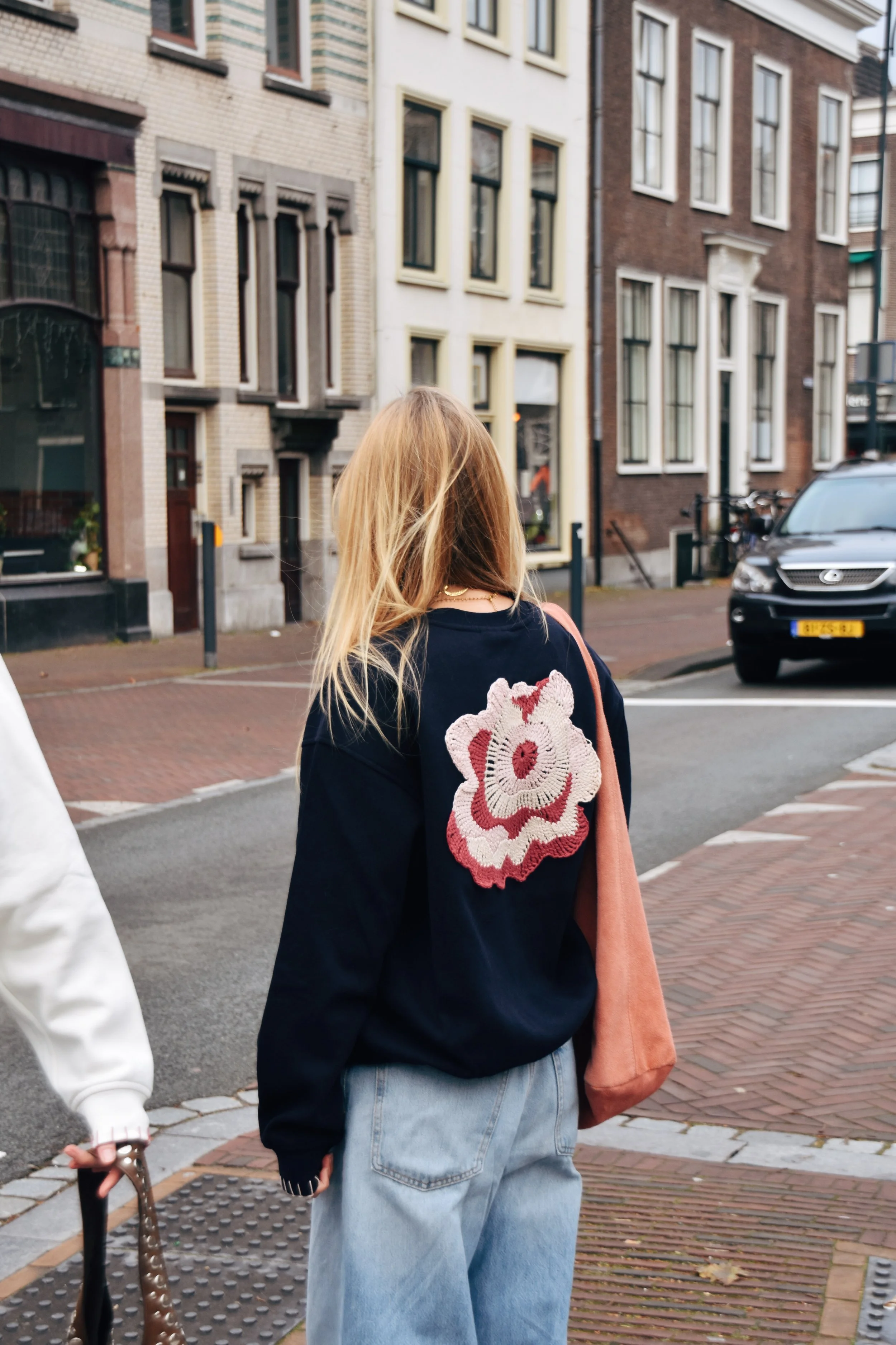 De trui heeft op de rug een groot gehaakt bloemmotief in zachte tinten roze, bordeaux en crème. Het motief is volledig met de hand gemaakt en aangebracht en elke keer is de vorm een klein beetje anders. Op de voorkant is het MIRAE logo met de hand geborduurd en op de mouwen zijn stiksels aangebracht.