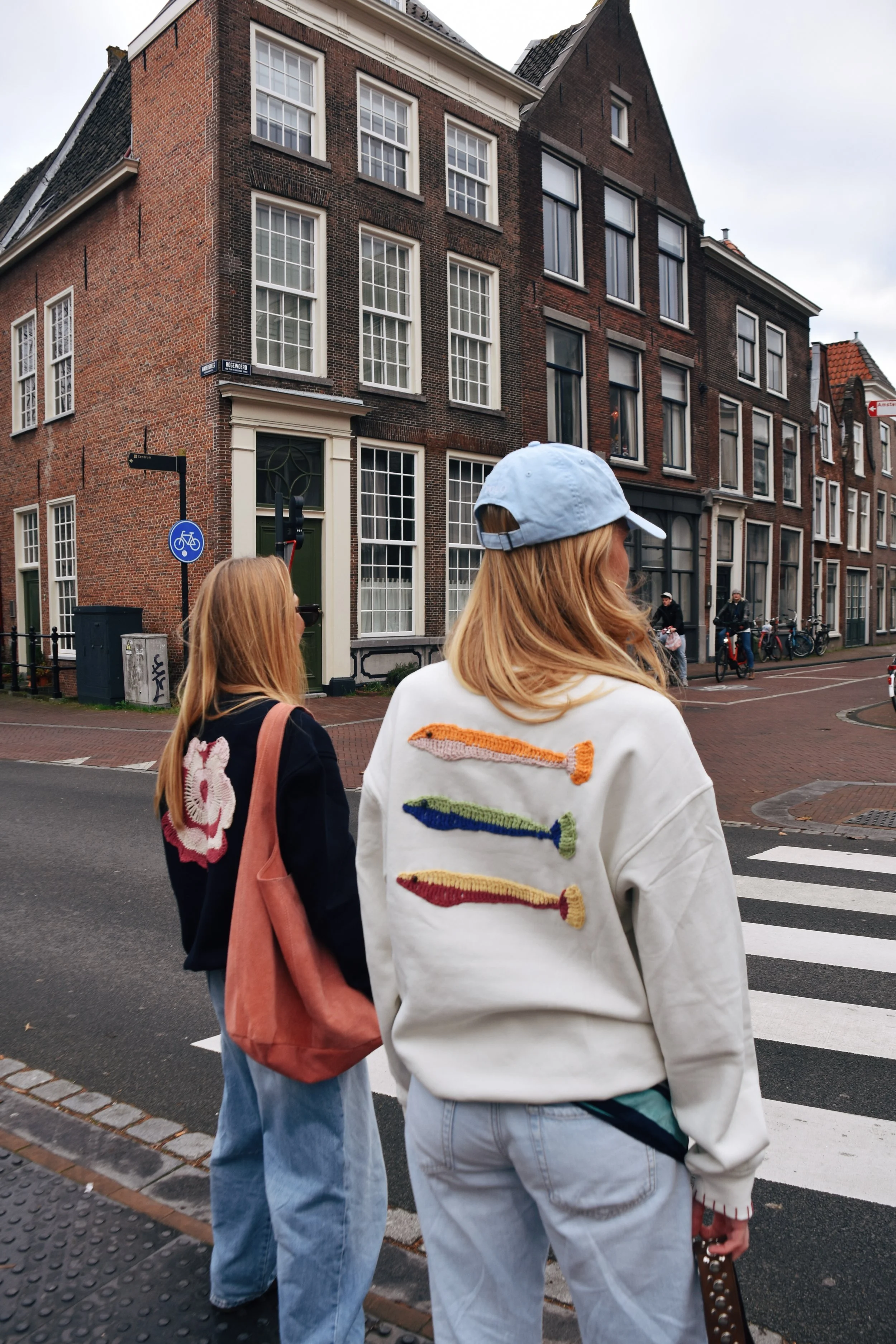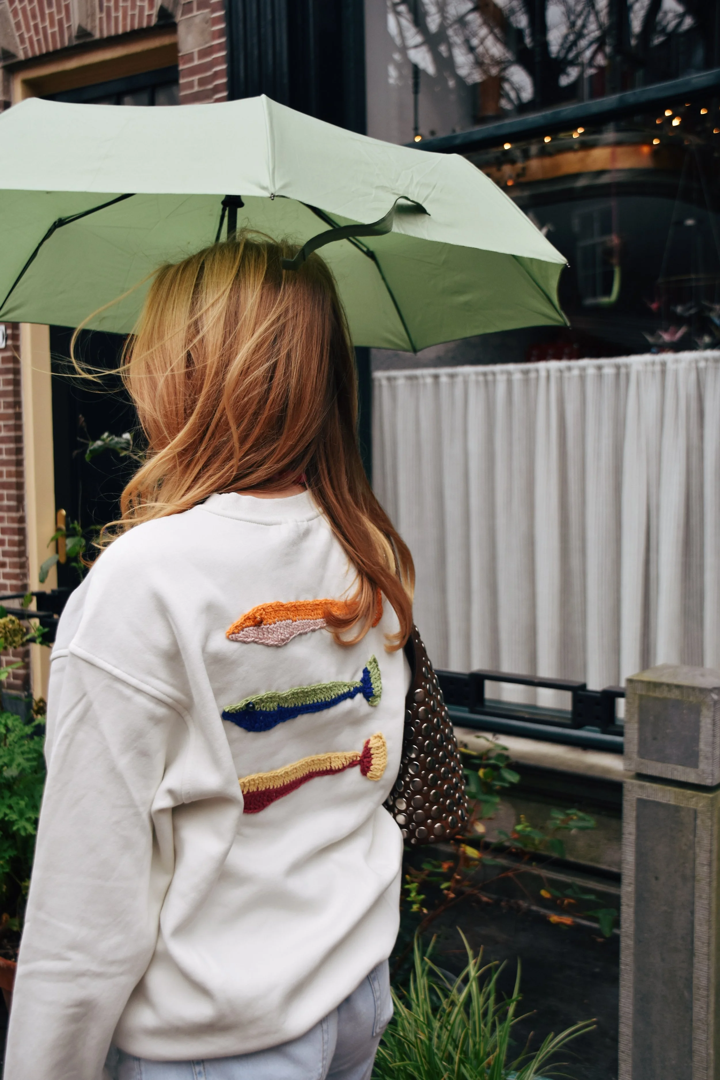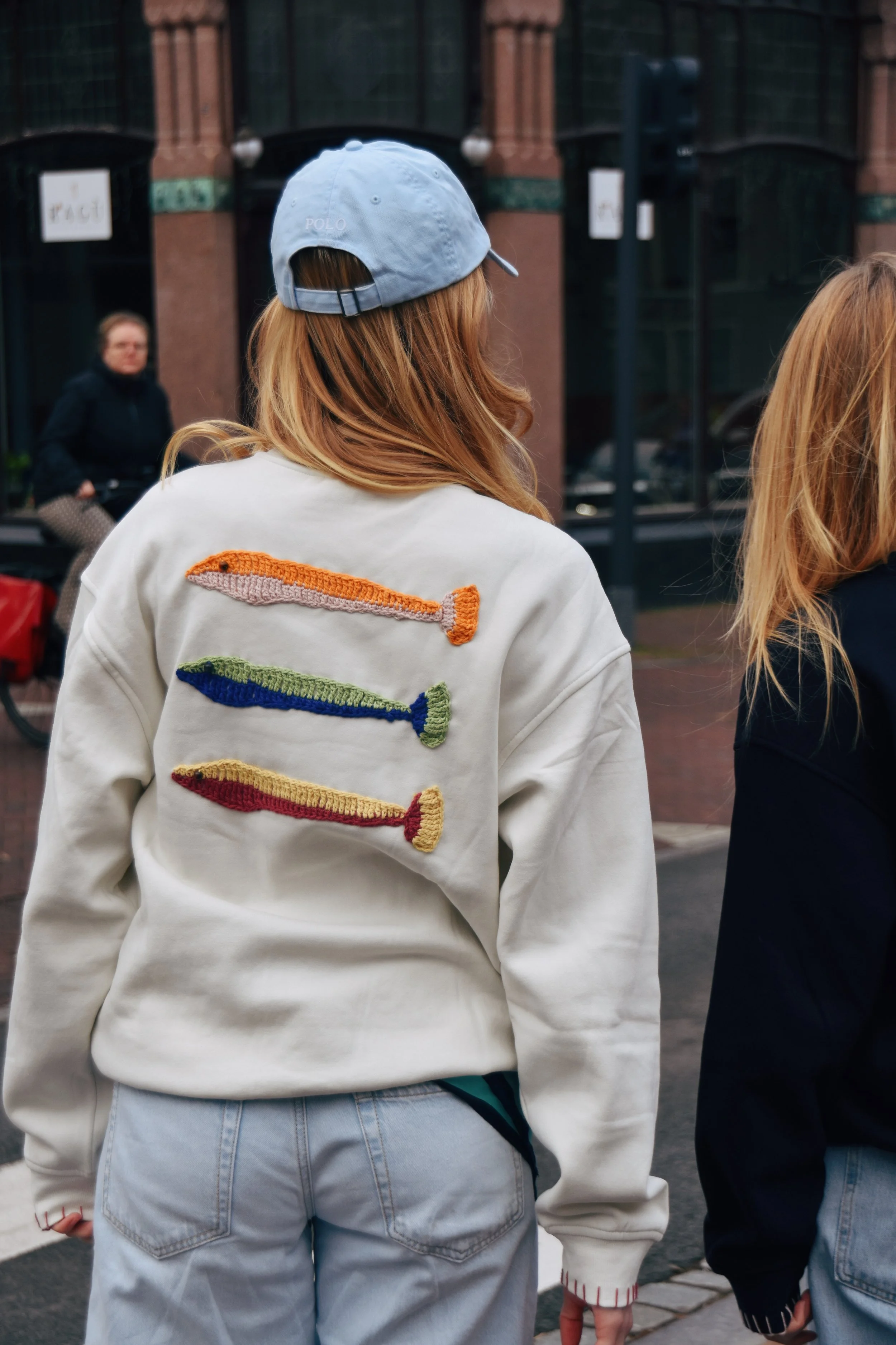 De crewneck is afgewerkt met gehaakte vissen op de achterkant, elk voorzien van gekraalde ogen. Geen print, maar handwerk waardoor elk item subtiel van elkaar verschilt. De mouwen hebben zichtbaar stiksel als detail en op de voorkant is het MIRAE-logo geborduurd.